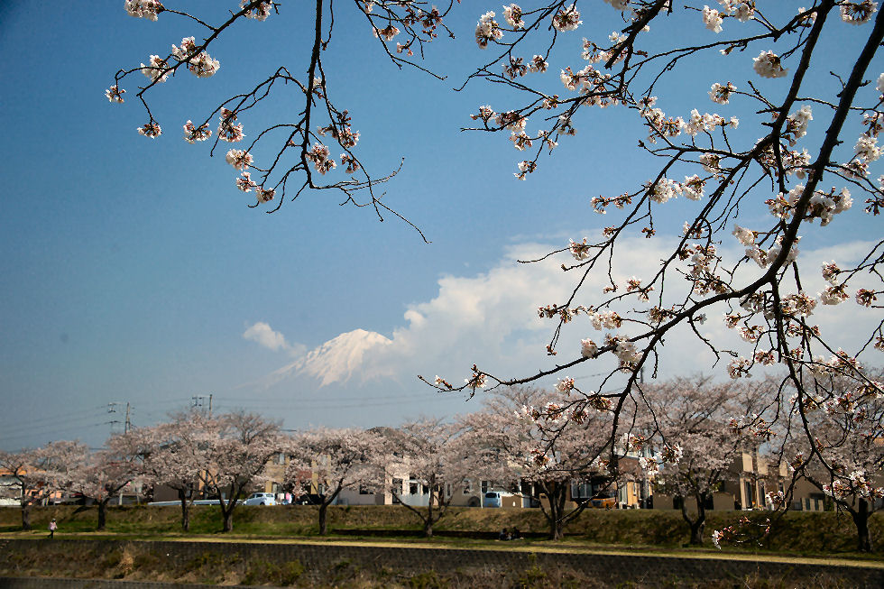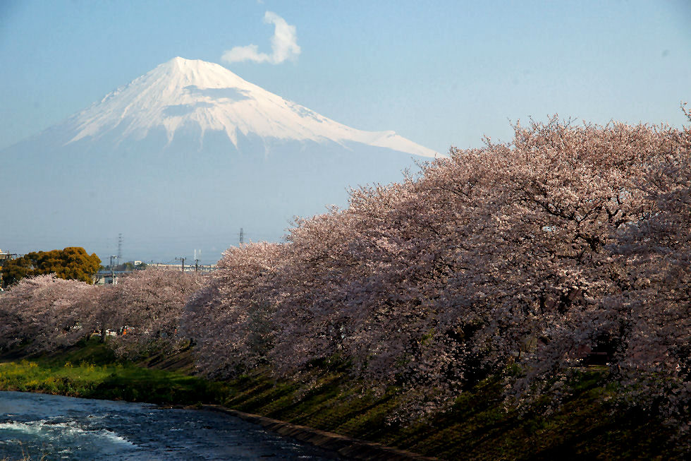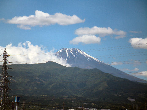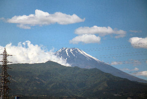 5月20日:静岡県からの富士山先月の三島手前あたりから見た富士山、南側は暖かさで雪が消えるのが早いのでこの風景。 |