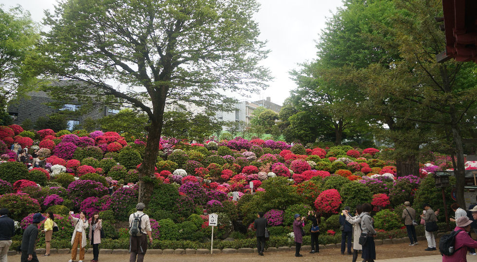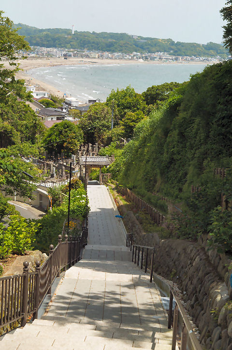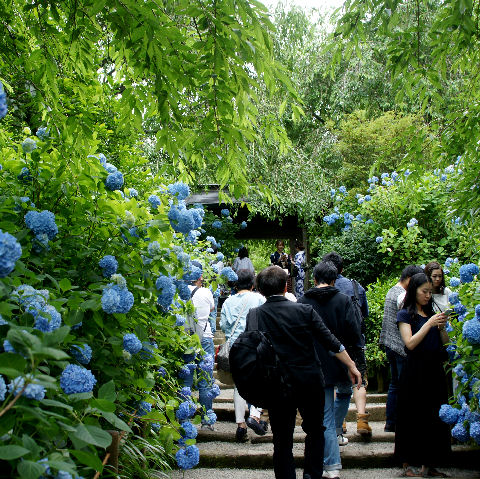 午後4時過ぎでも人の波紫陽花の道の階段は撮影する人で渋滞?だいぶ空いてきたがここだけは混んでいる。 |