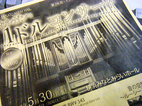 みなとみらいホールの1ドルコンサートへ前から知ってはいたが行ったことの無かったパイプオルガンの1ドル・コンサート。12時10分から50分までの短いプログラム。 |