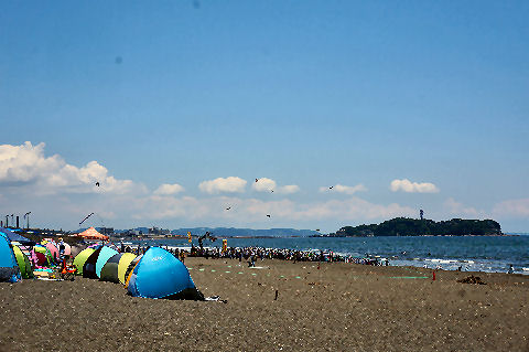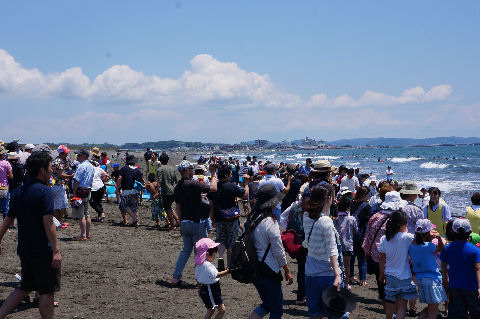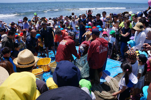 海岸では地引網五郎引丸の地引網、今はほとんど観光地引網で休日しかやっていない。 今日はどこかの幼稚園のイベントで開催、ほとんど曳いてから園児や親が曳くという算段。 |