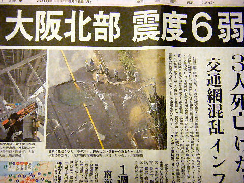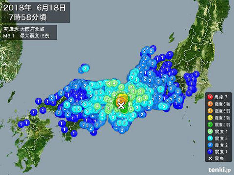 大阪地域で強い地震が発生朝8時前に大阪で大地震が発生、浅い地震だったが広い範囲で交通網がマヒとなり復旧までに長時間を要した。 |