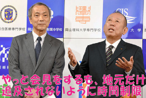 加計、アリバイ作りの会見が見え見え朝、突然の会見実施と発表、要は主要メディアが来られないようにした?時間も25分だけ、質問数も制限と会見したというアリバイ作りが目的としか思えない内容。 |