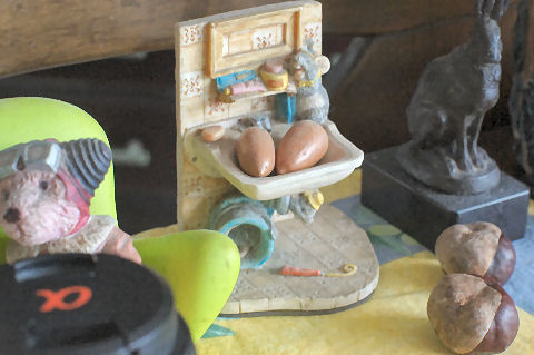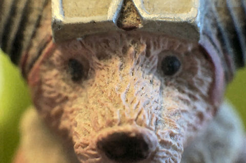 撮影してみた上の熊の置物を接写したのが下の画像、100%くらいの接写で全体は入らない。 ベローズが縮んだ状態でも35mm位あるので接写リングをかなり挟んだ状態に相当。 |