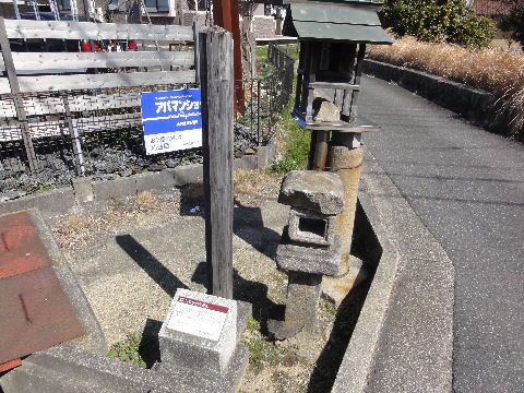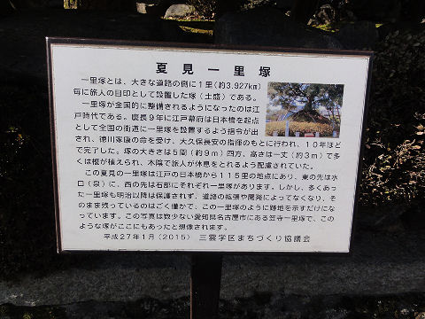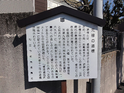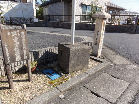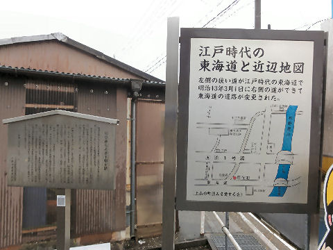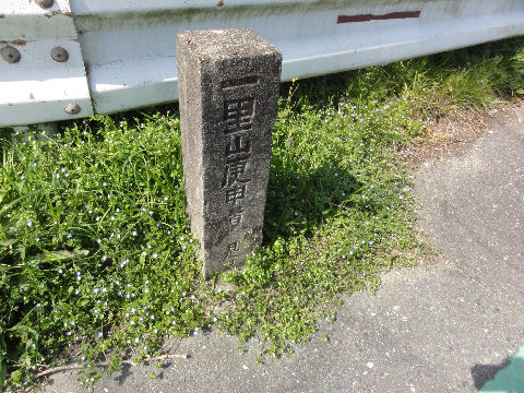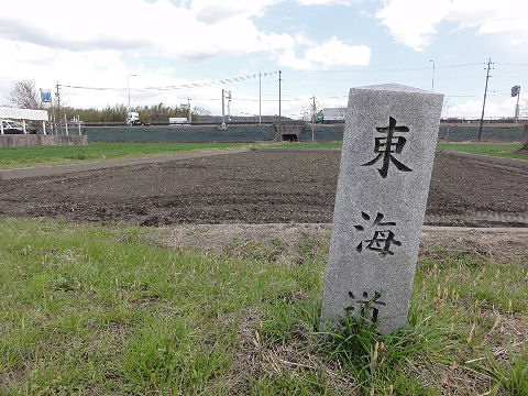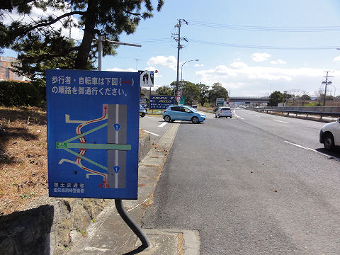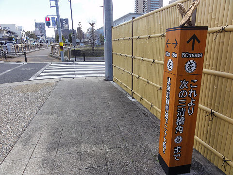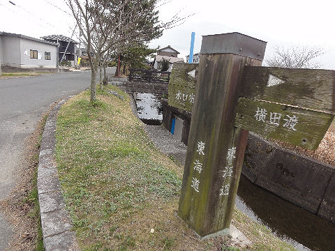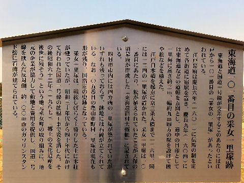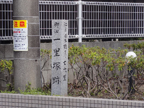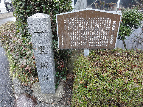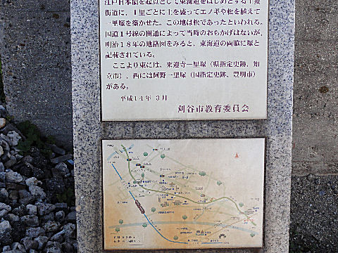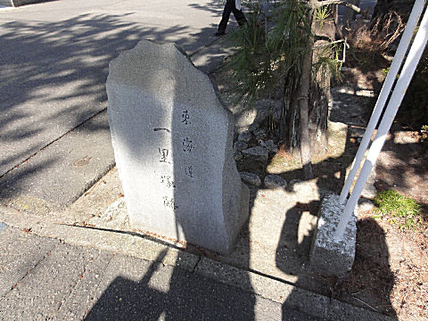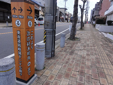 すぐ境橋で尾張の国から三河の国へ入る。安城市へ入る地点の横断歩道橋の足元にある一里塚の標識を見て進む。
