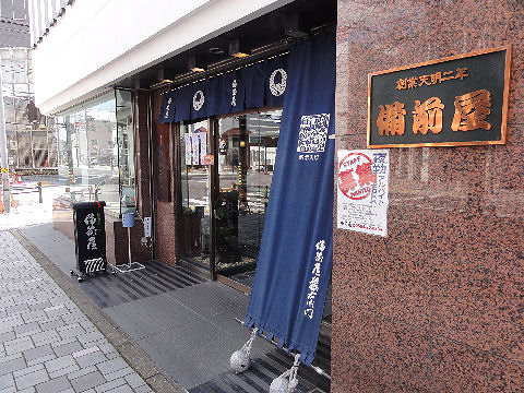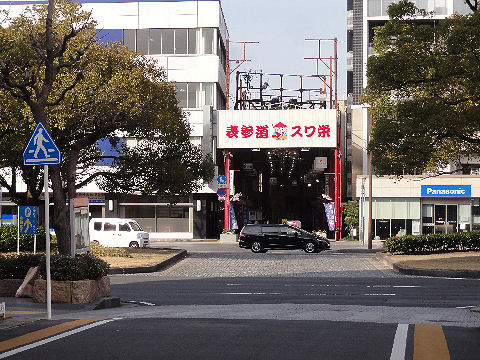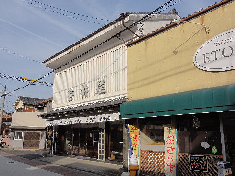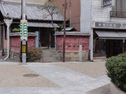 向こうに諏訪神社参道のアーケード、商店街を抜けて1号線を渡り並行する旧道を進む。なが餅の笹井屋、橋を越えたら三ツ谷の一里塚跡。