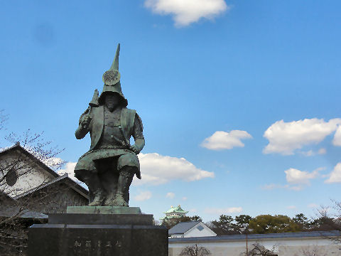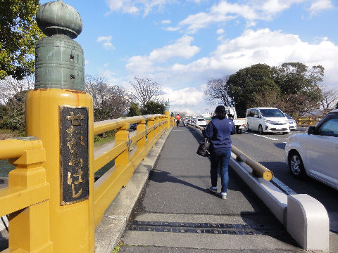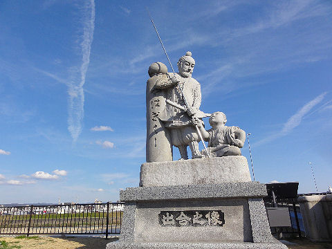 左へ入り旧道を進むと堤防手前に4つ目の一里塚のあったと思われる場所。矢作橋の手前の出合いの像を見てから橋を越える。右手へ降りて