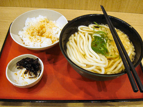 朝7時から開いている改札前のうどん屋で朝ご飯、朝定食320円。素うどんにご飯+卵というメニュー。