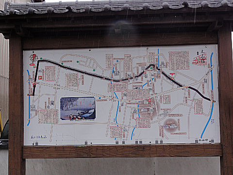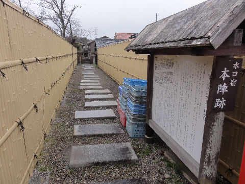 踏切を越えると街道は3つに分かれるので中央の道を進む、再び合流し宿場の出口へ。雨が本格化し傘を差しながら歩くことに。