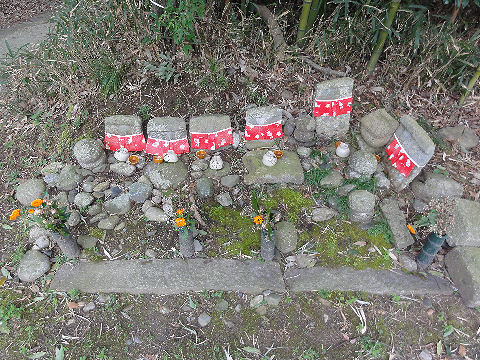 田楽発祥地の目川で一里塚を見た後、狭い旧道を進んで足利義尚の陣屋跡、すずめの茶屋跡、大きな商家を眺めながら六地蔵の
