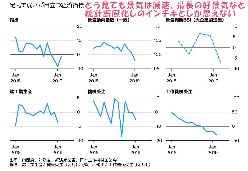 まだ「景気はゆるやかに回復」とか寝ぼけたことを言っている。「一部に弱さ」というがどの指標も下がる傾向にしか見えない。
