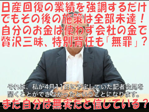 日産を愛している(そうだろう金蔓だからな)、俺は嵌められた、という主張の繰り返し。肝心の金をちょろまかした特別背任には 何の言及もなし。確かに日産の立て直しの寄与は大きいが、だからといって何をしても許されるはずはない。 |
