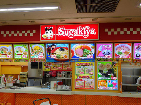 SUGAKIYAはあちこちにあるラーメン屋、一番安いのは320円と驚きの価格。安いので学生などをよく見かける。 創業者が菅木さんなのでこの店名らしい。喫茶店で創業、ラーメン店へ転換。 |