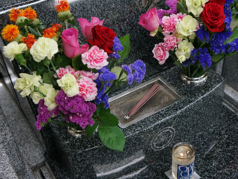 早いもので亡くなってからもう七年経った。お酒が好きだったのでワンカップの蝋燭(カメヤマ・ローソク製)を持参。 |
