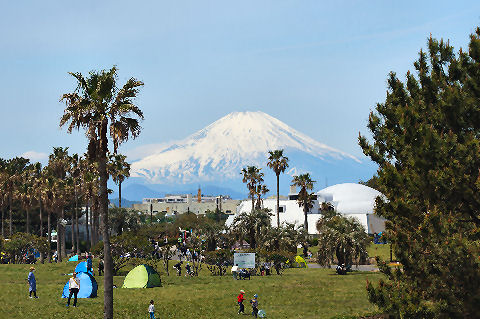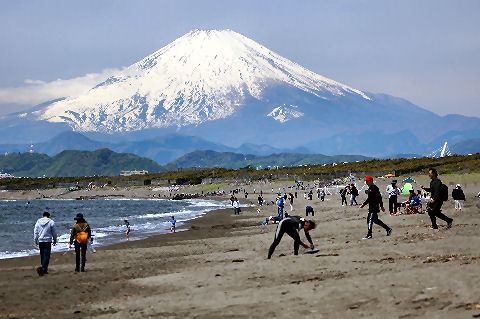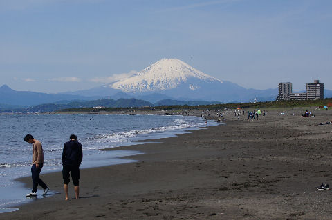 昨日の悪天候が嘘のような好天、海岸には人が多数。 |