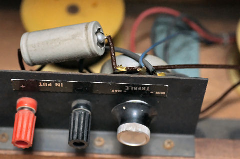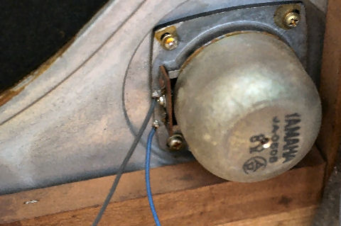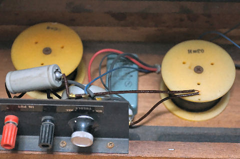 アッテネータが届いたので裏蓋を開けて交換を試みるも内部の配線はNS-250とはだいぶ違い手作り感いっぱい。 アッテネータの端子を中継に使うなんて素人配線のよう。 |