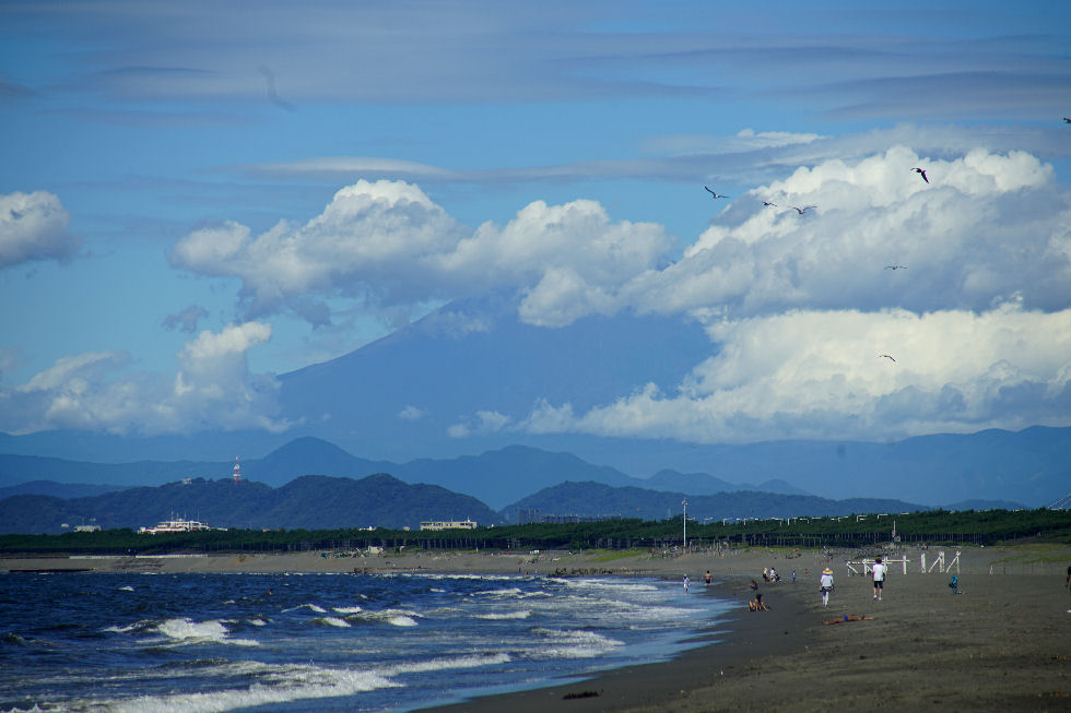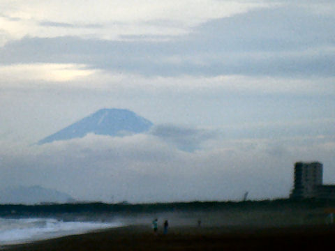 散歩の帰路、富士山の上半分が見えているので海岸へ回り道。 久しぶりの海岸からみる富士山、コントラストは低いが上半分は見えている。 |