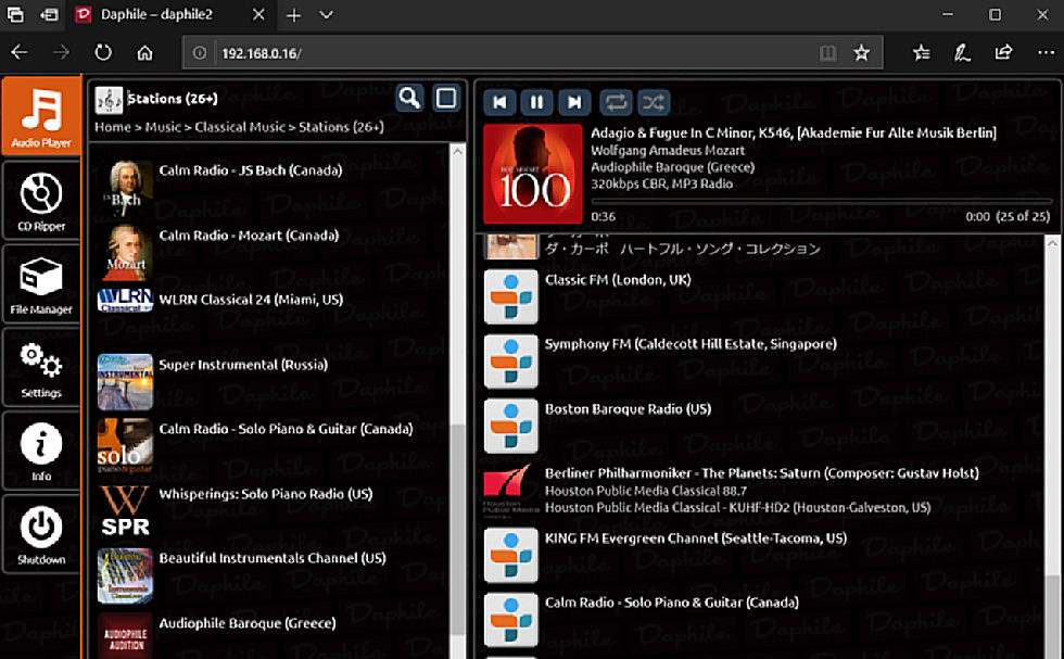 Daphileなら世界中のネットラジオから選び放題、国別・ジャンル別などをキーにして。 クラシックの曲も多い、ビットレート32KBPS程度から256KBPSまで種々あって選択が肝心だが。 |