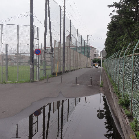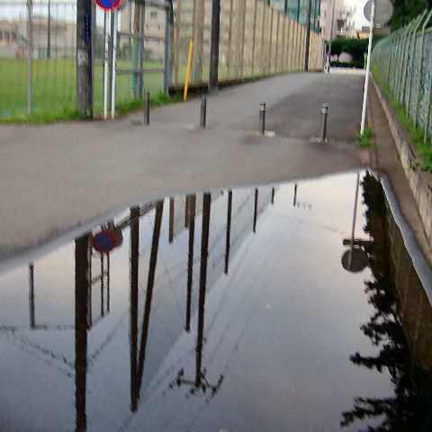 散歩コースに雨の後は必ず出来ている水溜まり、排水口の上だがいつまでも解決しない不思議な場所。 |