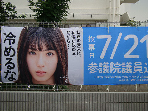 隣りの学校の入口近くにあった選挙へ行こうというアピール、白石聖って誰?自分勝手な解散で濫用しかしない アホノミクス首相は参院選の議席目標をさっさと引き下げて責任逃れに一生懸命。 |