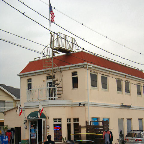 何故か屋上に星条旗がはためくサーファーショップ、アメリカ西海岸で見かける風景だが。 |