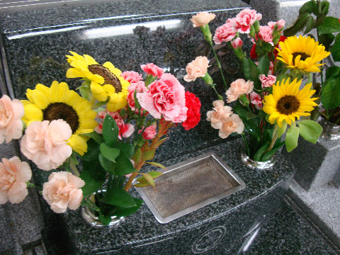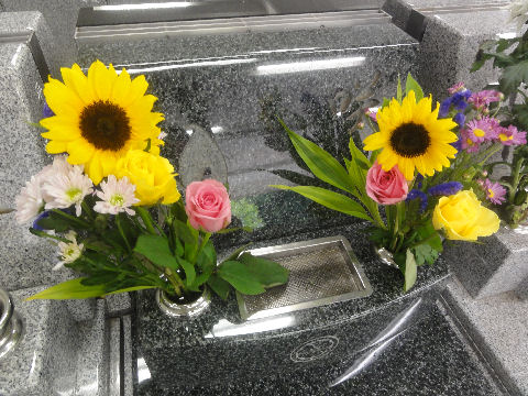 15日ぶりの墓参り、暑いので花の水はすぐに無くなり花は全滅。 |