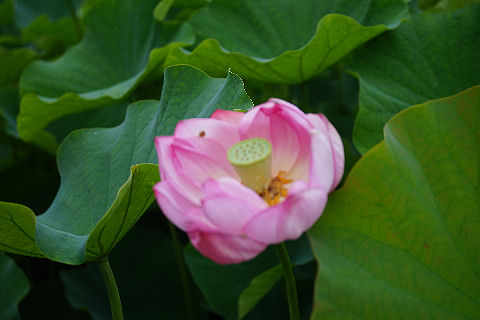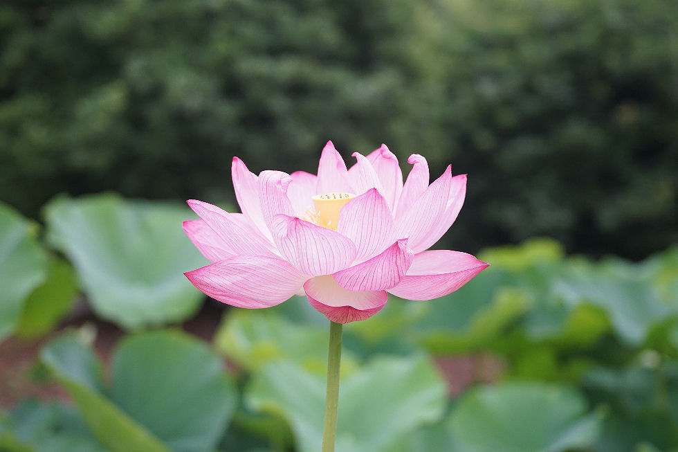 蓮が咲き始めたとのことで見に出かけたが早すぎた、まだほんの数輪だけ。手前の池の睡蓮は結構咲いていて見頃なのだが。 |