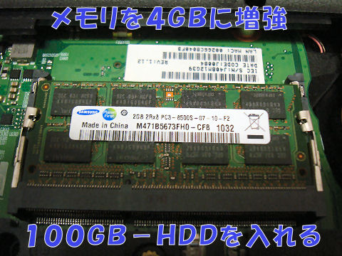 まずは通電と画面表示、続いてLINUXのDAPHILEでHDD無しの動作確認、すべてOKのよう。 その後、メモリを2GBから手持ちを追加して4GBに増設、100GBのHDDを取り付け。 このHDDにはWindows7が入っていたので裏面の認証コードでオンライン認証をして完了。 |