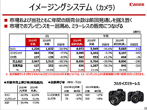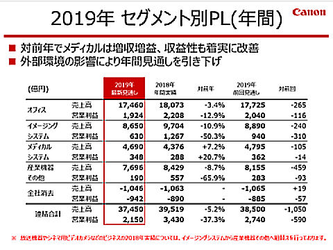 キャノンがまた売上と営業利益の見込みを引き下げた、主因はデジカメの不調で営業利益は-590億円と大幅減。 キャノンは複写機でのビジネスが最大セグメントでデジカメはその次、東芝から取得した医療機器事業は構成比10%とまだこれから。 |