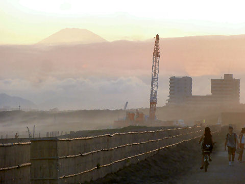 いつもは夕方になると雲が消えて富士山の全体が見えるようになるのだが、今日は雲が増えるばかり。 |