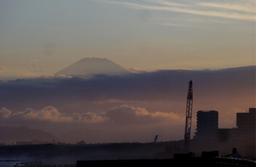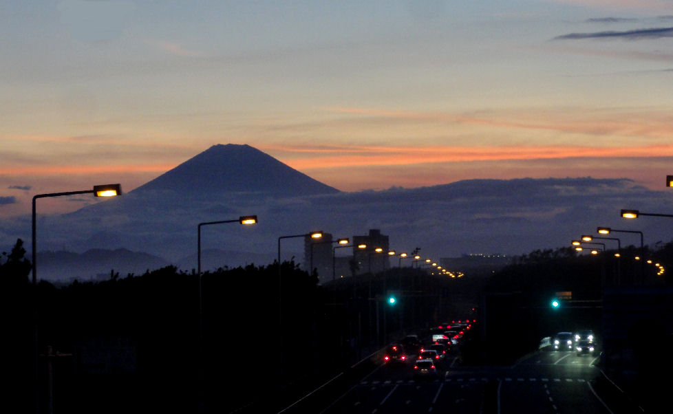 夕焼けも久しぶり、富士山は雲で山頂だけ見える