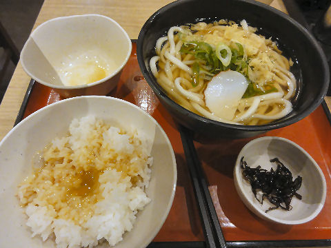![]() ![]() ![]() 朝6時前に大垣着、時間に余裕がある(乗り継ぎが悪い?)ので30分以上休憩し米原経由で草津へ。 駅にあるうどん屋で朝食(朝うどん、卵掛けご飯付)、通勤時間帯だがあまり混んでいない関西圏。 |