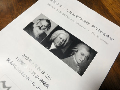 ![]() ![]() 無料招待ハガキで入場無料、席は自由。プログラムは、1)バッハ:管弦楽版・ジーグ風フーガ、 2)モーツァルト:交響曲第41番「ジュピター」、3)バッハ:管弦楽版・シャコンヌ、4)ブラームス:交響曲第4番、 アンコールはなし。 |