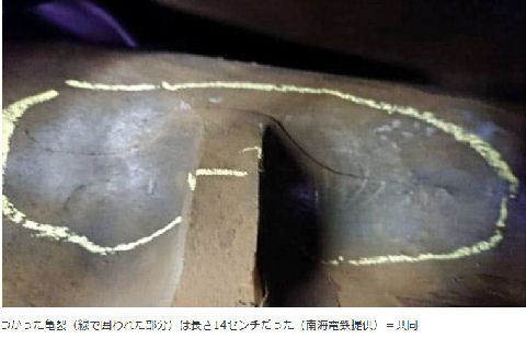 ![]() ![]() 今回も車掌が異音を聞き、点検員が発見できないまま走行を続けたのは前回の新幹線台車と同じ状況に見える。 車両メーカは東急車両(現在はJR東の子会社)だが台車は住友金属(現・日本製鉄)が製造、亀裂はモータ吊り下げ部の上部 にあるように見える。割れていたらモータ落下で脱線していたかも。 |