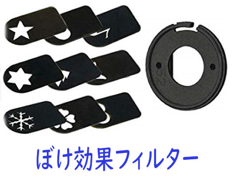 アマゾン経由で注文したボケフィルタのセットが届いた、1242円で送料込み。まあ造りはやや雑(背面が黒くない)だが自分で作る紙製よりはずっと立派。
