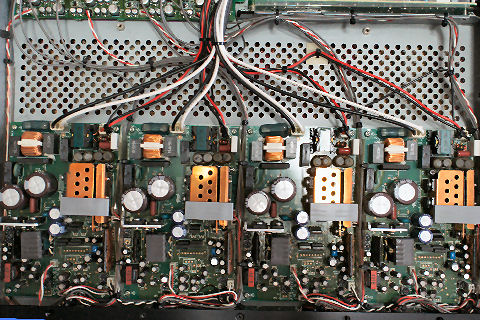 上がアンプ全景、1Uラックサイズに4つのアンプユニットと周辺回路をぎっしり収容。
