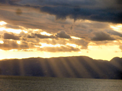 日が長くなり5時半でもまだ明るい、西の空は最近雲が一杯で富士山も見えず。雲の隙間からさす陽が 光芒のように見える。 |