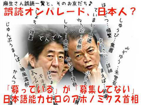 次々と「ご飯論法」や「募るが募集はしてない」などの迷言ばかるり乱発するアホノミクス宰相、支えるギャングの副総裁も ほとんど同じレベルの低能ぶりの漢字もまともに読めない迷コンビ。 |