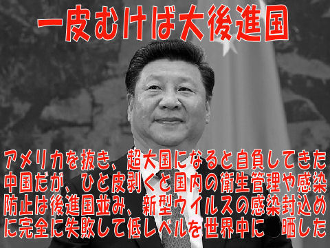 新型コロナウィルスで世界中に迷惑をばら撒いている中国、共産党の独裁体制で優秀な若者はみな共産党へ取り込んで 文句を言わせない恐怖政治に近い、経済活性化でぼろ儲けした一部富裕層は海外旅行で顰蹙をかうばかり。 椅子以外の四つ足は何でも食べると言われた中国の食文化を改めて衛生環境を大幅に改善しない限り、今後の再発は必至。 |