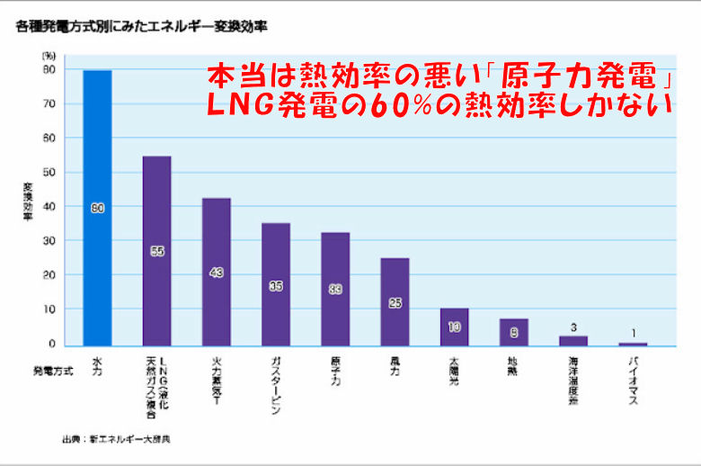![]() 「原子力は環境にやさしい」の大ウソ 発電時に二酸化炭素を多く出さないので環境にやさしい、地球温暖化にも良いと電力会社に都合の良いように宣伝されてきたが、 実際には燃料を作るのに膨大なエネルギーを要して二酸化炭素も排出(これは電気自動車と同じゴマカシ)、更には発電時の熱効率が 最新のLNG発電に対し60%しかないので発電量の2倍の排熱を環境に排出(主に海水の温度上昇となる)している不都合さは隠蔽した まま、自分達のメリット(儲かる)を最大化してきた。規制が厳格となり経済性は急激に悪化、熱効率の悪さは原子炉の耐熱性の低さ、 高温では炉心が融けてしまうので無理からきているので解決は無理。 |