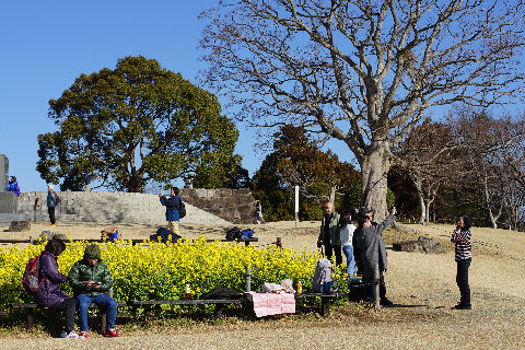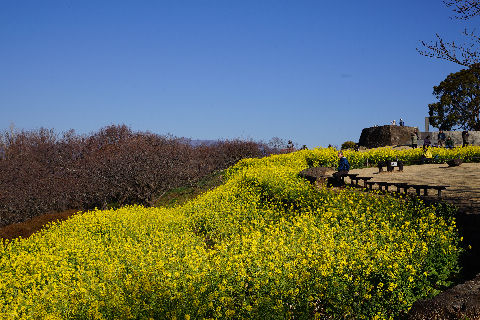往路は役場口から300段の階段を登り尾根伝いに芝生広場へ、途中管理事務所でスタンプラリーの用紙を 入手し捺印。菜の花は今が見頃だがそれほどの混雑でもない(例年比)。 |