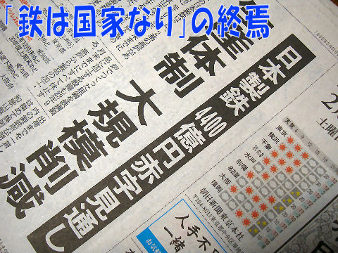 日本製鉄が赤字4400億円の見込みで呉製鉄所(旧・日新呉)の全面閉鎖、八幡の高炉1基停止を発表。 もはや「鉄は国家なり」という時代は終焉した、かつて栄華を誇ったアメリカの製鉄企業は跡形も無く消滅、 建設ラッシュだった中国も能力過剰で赤字輸出、市場を混乱させている。 今は絶好調の自動車産業も人口減で2-30年後は同じ運命かもしれない。 |