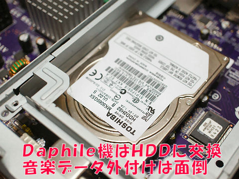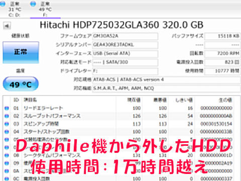 Daphille機から外した3.5インチのHDD、動作時間は1万1000時間近い、外付けケースでデータの低頻度バックアップに利用。 SSDに換装したDaphile機は音楽データが外付けではやはり使用上不便なので手持ちの2.5インチ500GBのHDDに再度交換。 もともと安価なジャンクなので壊れるまで使い更新の予定。 |