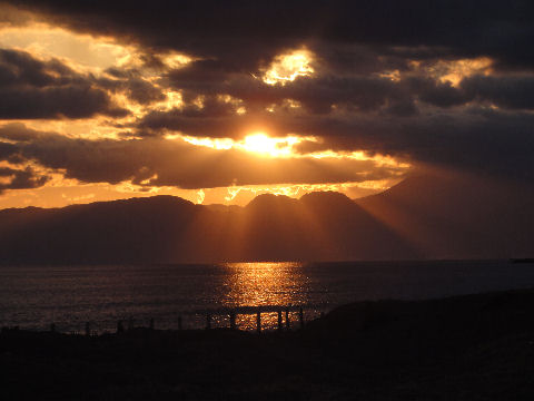 土曜日なので人が多い、雲が低くてるが太陽が隠れ山影から光が漏れるという風景に。 |