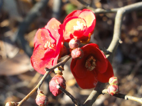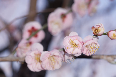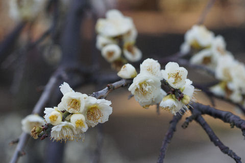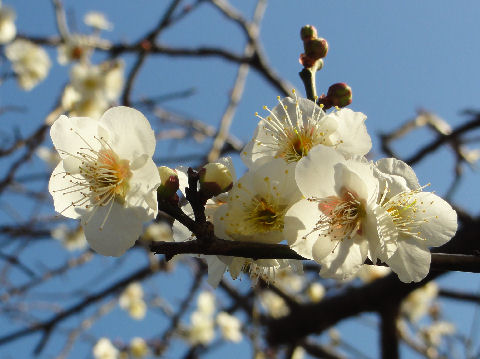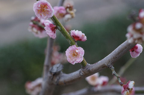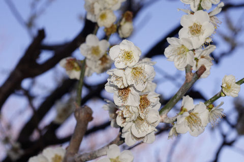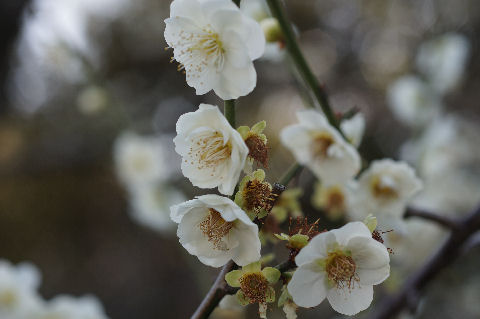 端っこにある梅林の梅もほぼ満開にちかい状態、梅の花は地味なのでマクロでアップで撮影。 |