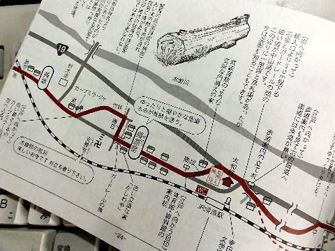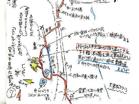手書き版ではJR線路を横断するルートだったが印刷版では通らないルートに変わっている、他にも上松宿北の歩道のない 国道区間も歩行危険なので川の右岸へ迂回するように変更されている。そうすれば木曽の桟の残る部分を見られるが。 |