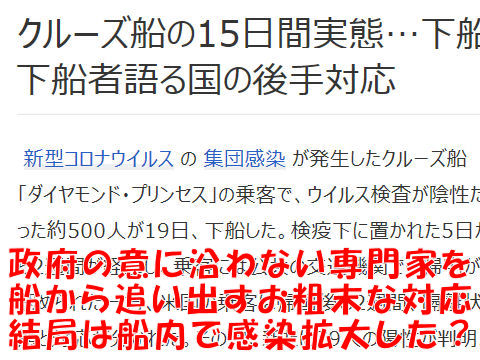 バカな副大臣が跋扈する船内、中国から穏便にという依頼での全面入国阻止をせず拡大を野放し? 内閣の対策会議は素人だけで1回10分の形だけ、毎日会食(それ税金で?)に明け暮れる口先だけのアベ。 |
