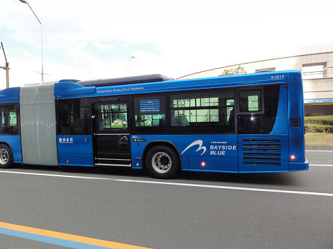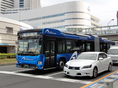 みなとみらいホールの前で横浜市の連接バスを見かけた、濃いブルーの色。日野自動車製、ドイツ車との違いは後ろの車体 のタイヤから後ろが相当高くなっている点(短所)、およびハイブリッド仕様(長所)だという点。ハイブリッド用のバッテリ は搭載場所がなく前半部の天井に設置、メンテが大変そう。 |