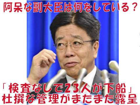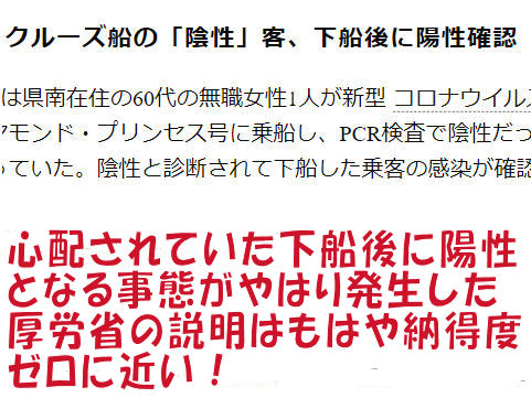 船内隔離後の陰性で下船した人から陽性者が出現、公共交通機関で帰宅して良いという驚きの対応だったが。 船内での検査は少しづつ長期に亘って実施したので検査後の感染もありうる事態だったが構わず下船OKという判断。 さらに厚労省職員も感染しているのに下船後の検査も実施して来なかった(発熱者のみを検査)、あのバカ副大臣も 検査なしのまま国会などへ出入りしていたお粗末さ。 |