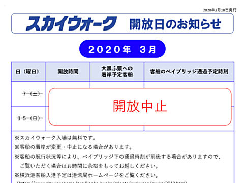 クルーズ船が来ないうえ大黒ふ頭でダイヤモンド・プリンセスが長期接岸しているので、それどころではない実情から公開中止に、残念。 |