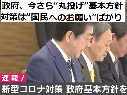 基本方針を発表としていたが結局は国民へのお願いだけ、政府は何もしない?専門家会議も後手後手になってから、 それまでは素人閣僚だけで一回10分の形だけの対策会議だけ、国民の健康確保にやる気がみられないアホ内閣。 |